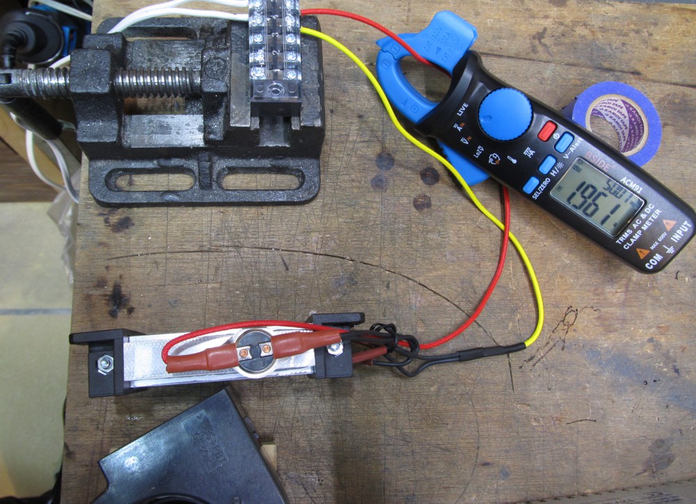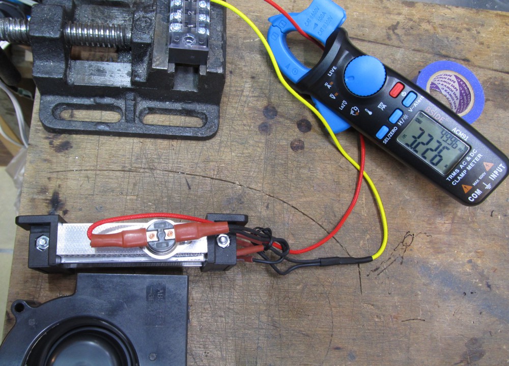 一枚目の写真は銀色のPTCヒーターにファンで送風中の様子です。 電流計が3.226Aを指しています。