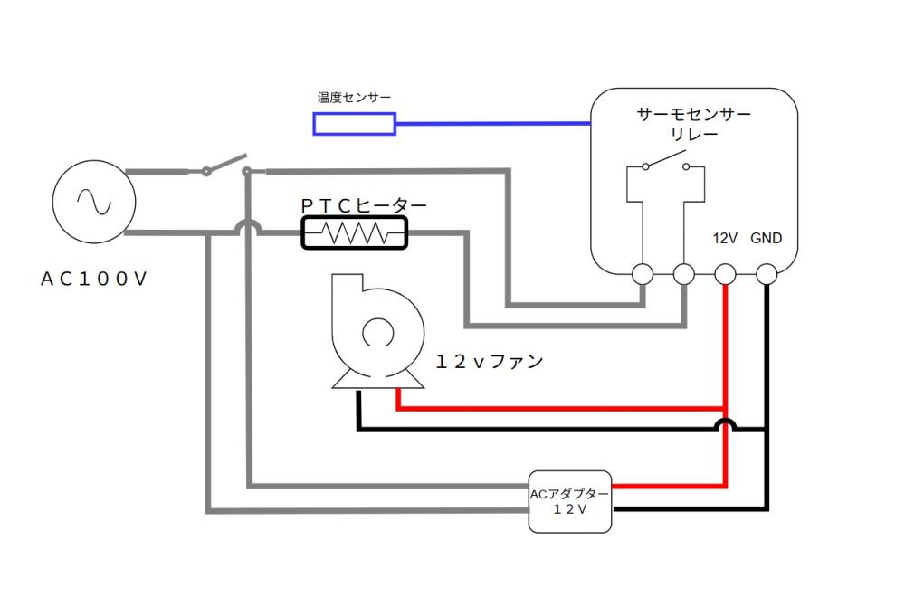 「PTCヒーター」「温度制御回路」「DCファン」を次のように組み合わせて使います。