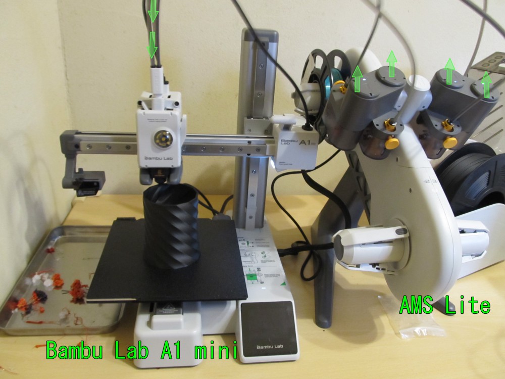 只今、黒い花瓶が印刷中ですが黒いフィラメントは「AMS Lite」には固定されておらず外付けの乾燥機から供給されているのが分かるでしょうか。