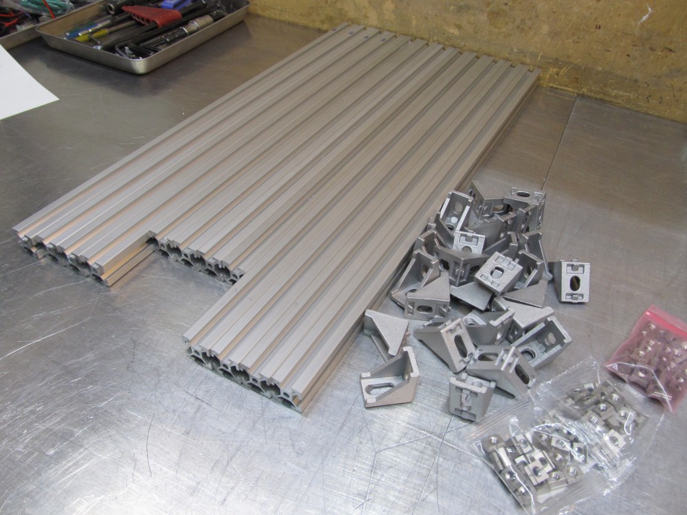 フレーム材同士はアルミコーナーブラケットで固定します。 意外と数がいるんですね。立方体の角は8つ。一つの角にブラケットが3つ。 3×8=24個