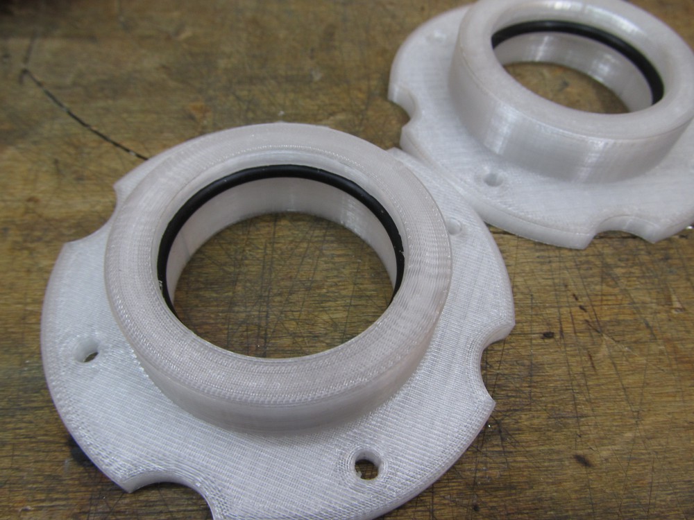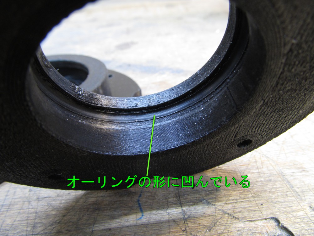 オーリングの溝はコの字型でしたがオーリングと主軸の摩擦熱で3Dプリンタ―用樹脂(PETG)が変形。