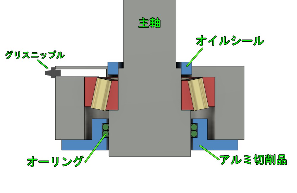 主軸下側ベアリングにオイルシールでグリス漏れ防止&切削屑の侵入防止対策を行います。