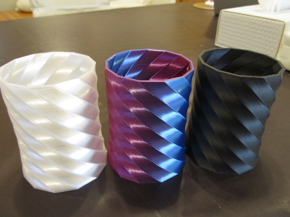 左は透明PETG、中央はシルクカラーのPLA、右はカーボン入りPLA。