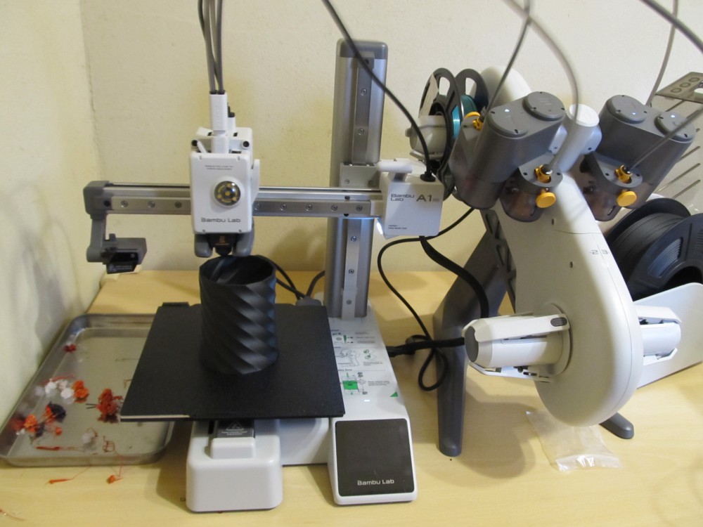 1台は、バンブーラボ(Bambu Lab)の A1 mini Combo(4種類フィラメントを装着できるタイプ)。 印刷テーブルが180㎜×180㎜のかわいいプリンターです。