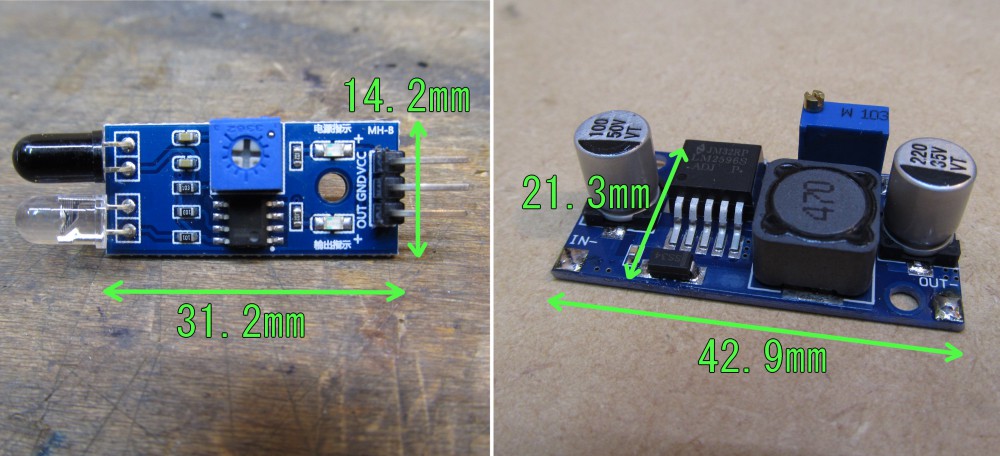 赤外線センサーの動作電圧は5vなので、右の降圧モジュールで12v電源→5vに落として使います。