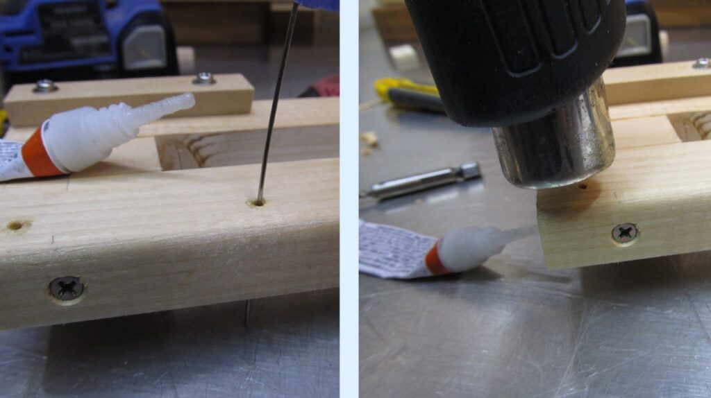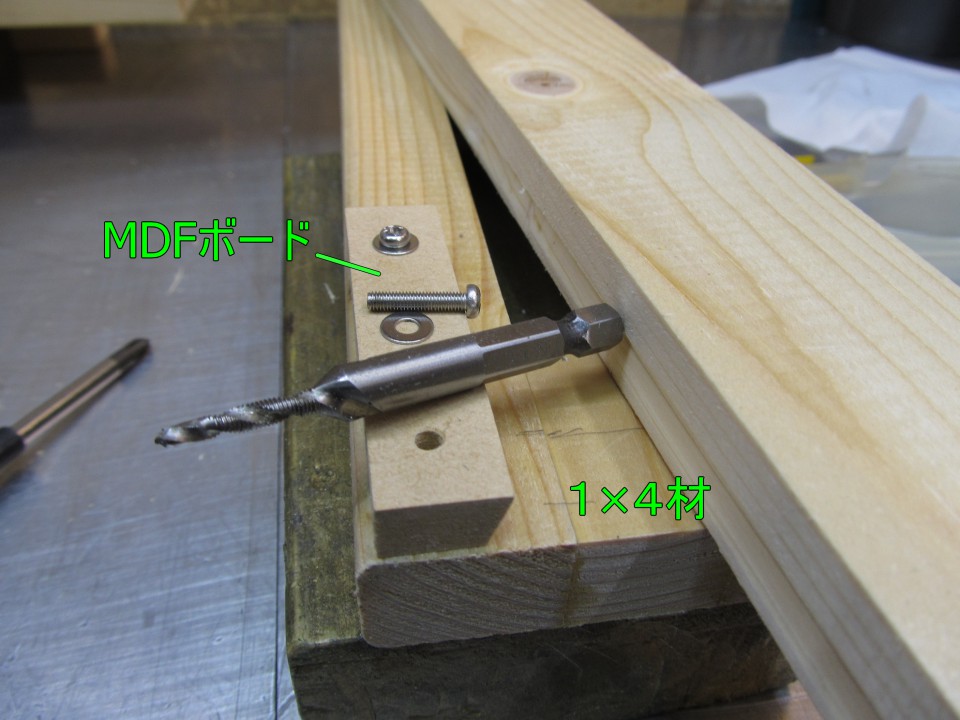 写真中の金属用タップで木材にネジ切り。 当然、ネジ山はすぐにつぶれてしまうので瞬間接着剤で固めてからネジを使用します。