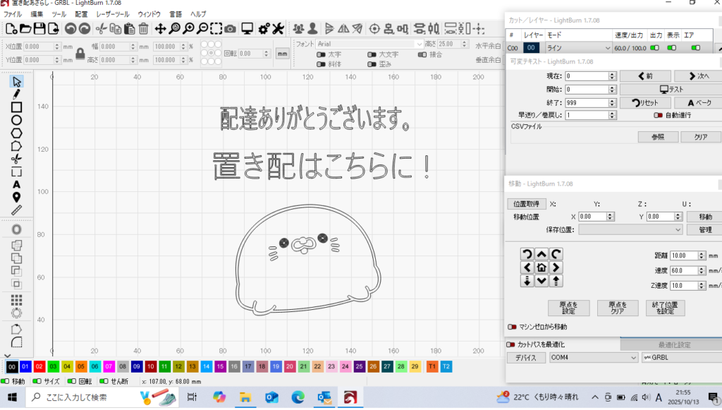 一年前に使ったファイルをダブルクリックして呼び出せば次の画面のようにレーザーカッターのソフト「Light Burn」が立ち上がりすぐ印刷可能に。