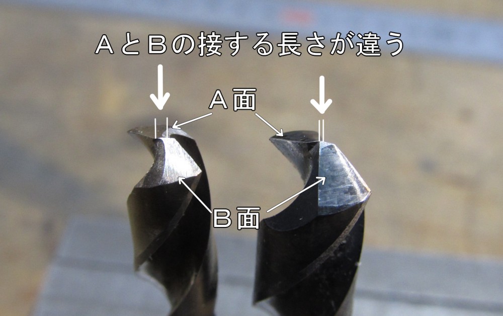 当然、左側が私が研いだドリルです。 右がほぼ新品のドリル。