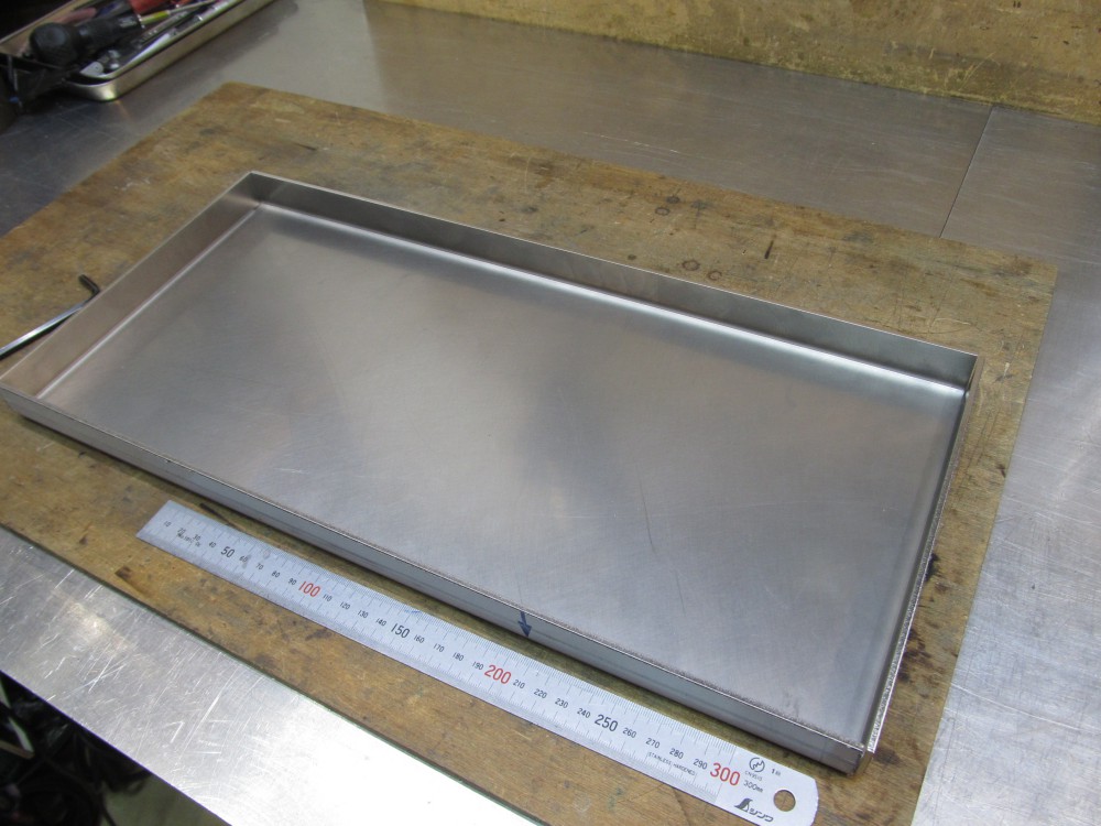 曲げ加工してもらったステンレス板3㎜厚を溶接して切削油受けを作りました。 ステンレス板を曲げるなんてうちでは出来ませんので「板曲げ.COM」さんに依頼しました。