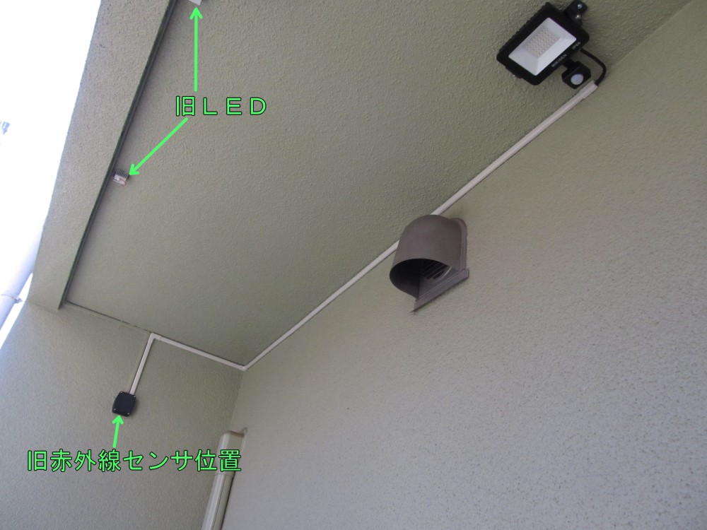古い配線と自作LEDは外壁の再塗装で自宅外壁と一体化していますので、設置したままににします。 外すと未塗装部分が見えて見苦しくなってしまいますので。