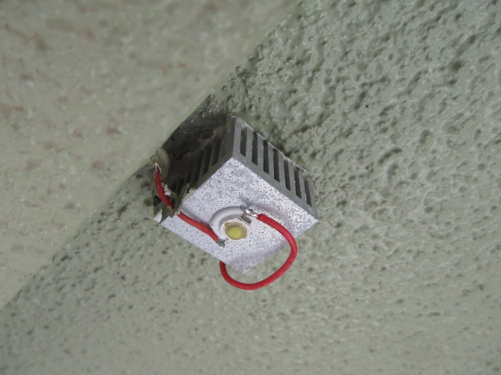 25㎜角のアルミ放熱器に1WタイプのLED素子を放熱用シリコンで固定したモノです。 これが3コ勝手口の軒天に付いていますので、結構明るく均一に照らしてくれていい感じでした。
